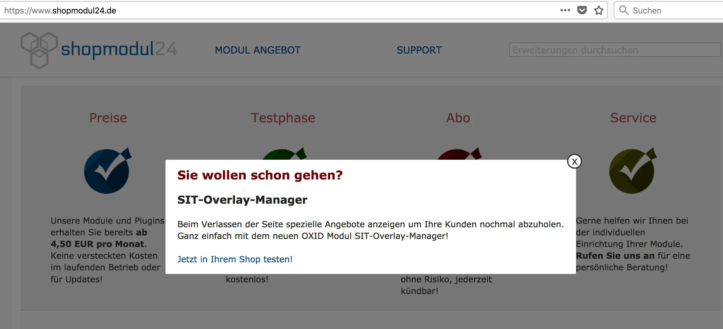 Exit-Intent: Die zweite Chance für Ihren Warenkorb: Verhindern Sie aktiv Kaufabbrüche. Das Modul erkennt, wenn ein Besucher den Shop verlassen möchte, und blendet in genau diesem Moment ein Overlay ein – perfekt für Last-Minute-Gutscheine oder persönliche Support-Angebote.
