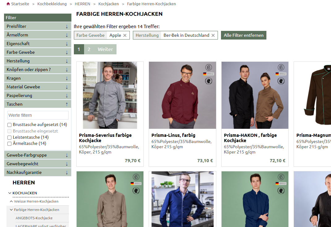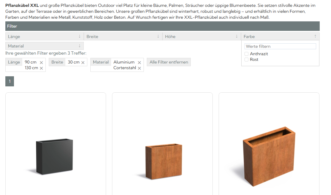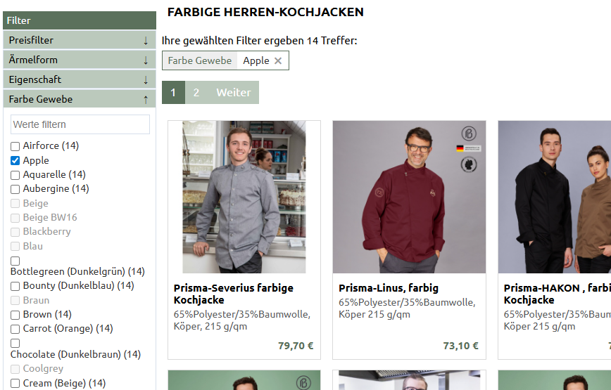 Pro Attribut können mehrere Filterwerte aktiviert werden. So können Sie z.B. mehrere Farben, Größen, Muster etc. zusammen auswählen.