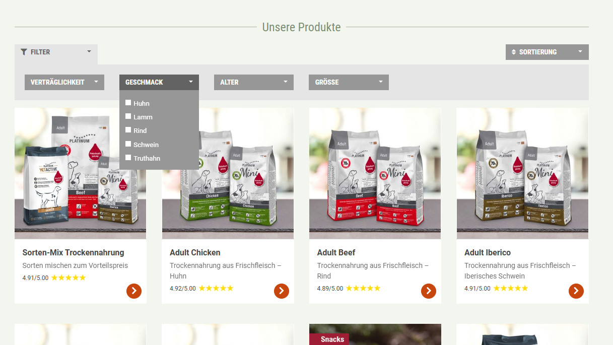 • Dies geschieht ohne Neuladen der Seite (per Javascript), so dass keine unnötige Wartezeit bei der Filterung entsteht.